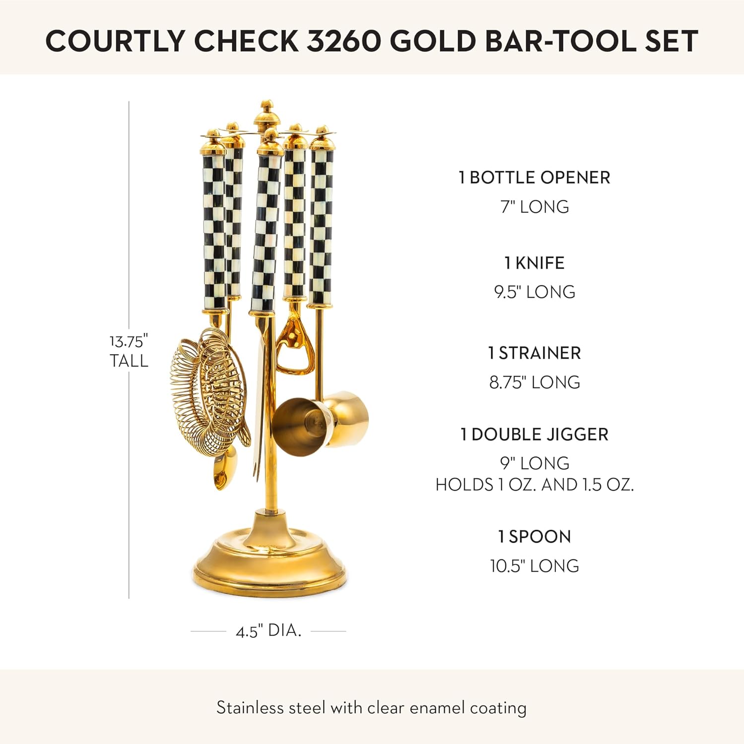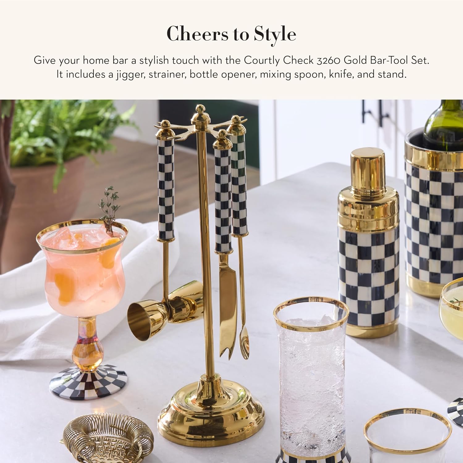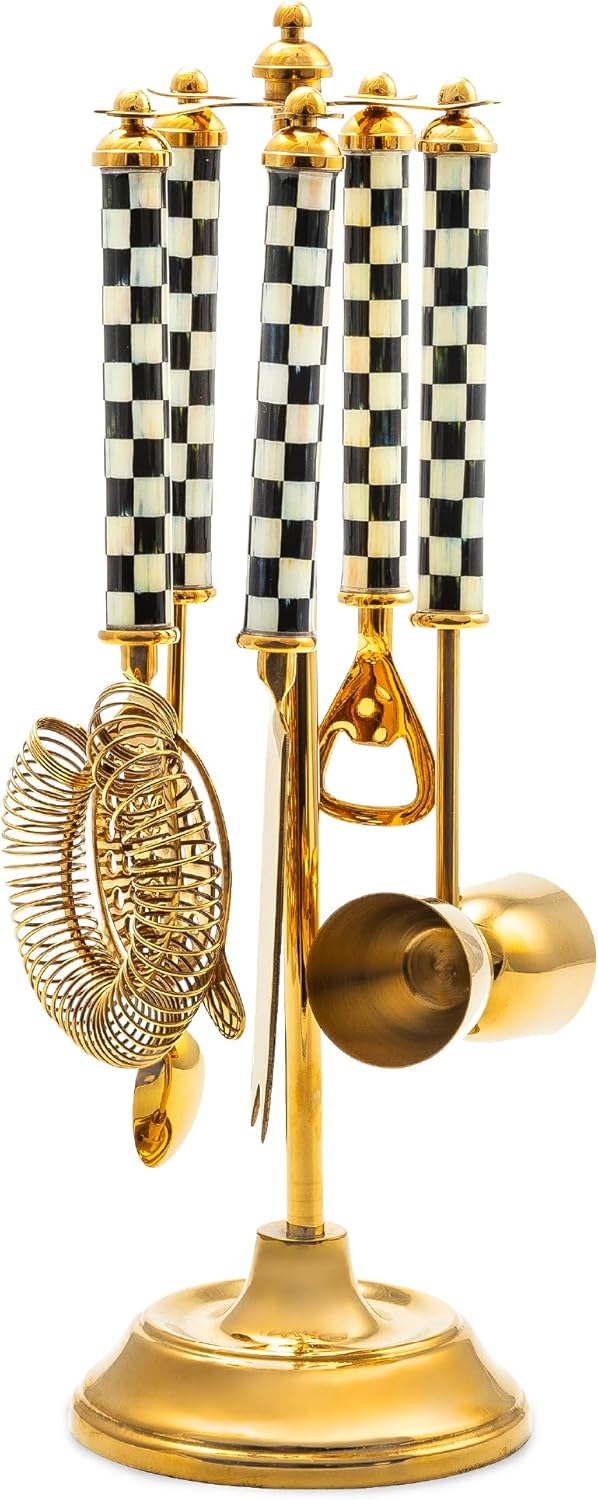 MACKENZIE-CHILDS 3260 Bar-Tool Set, 5-Piece Set with Stainless-Steel Jigger, Strainer, Bottle Opener, Mixing Spoon, Knife, and Stand, Black-and-White Courtly Check Gold