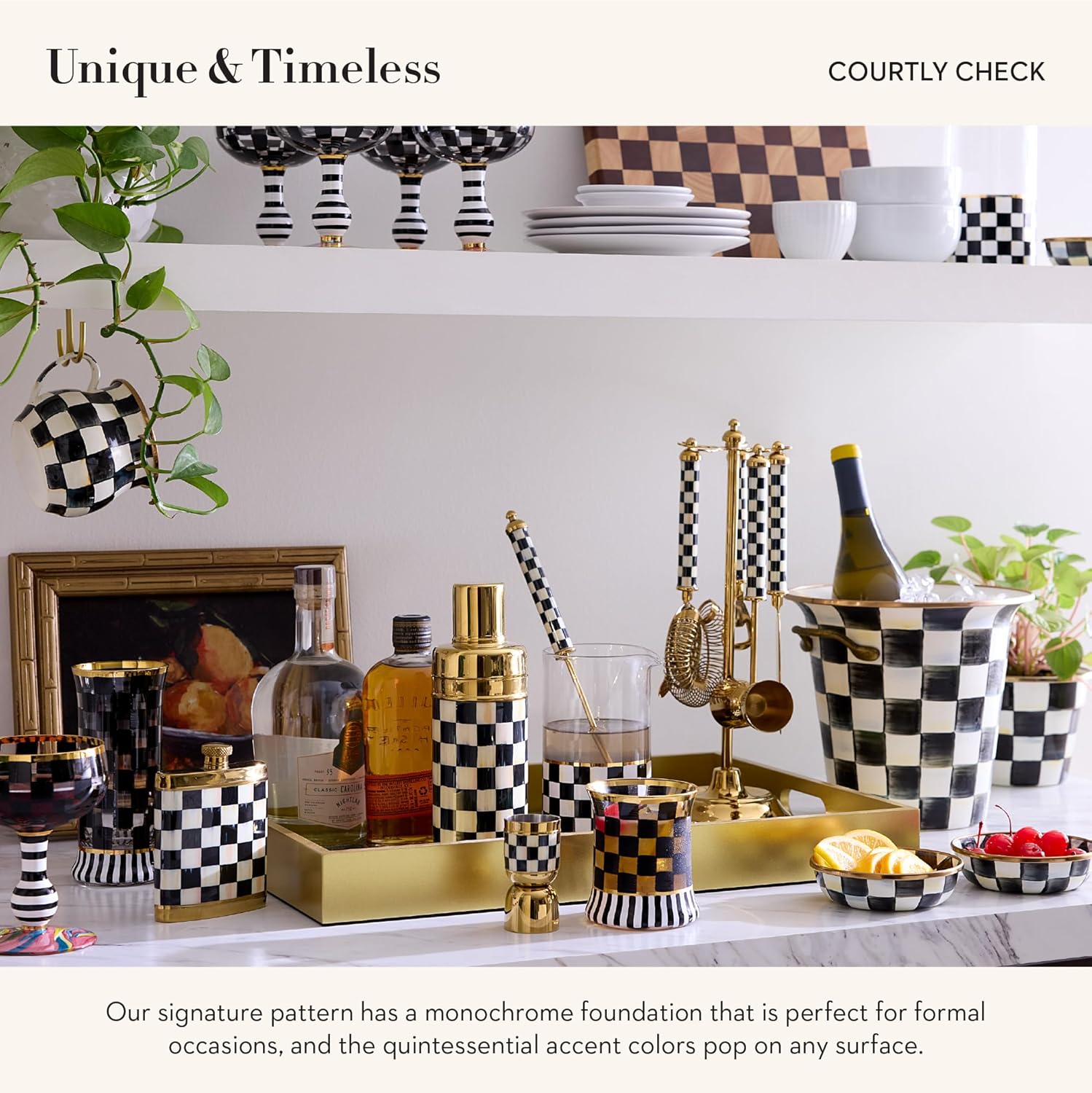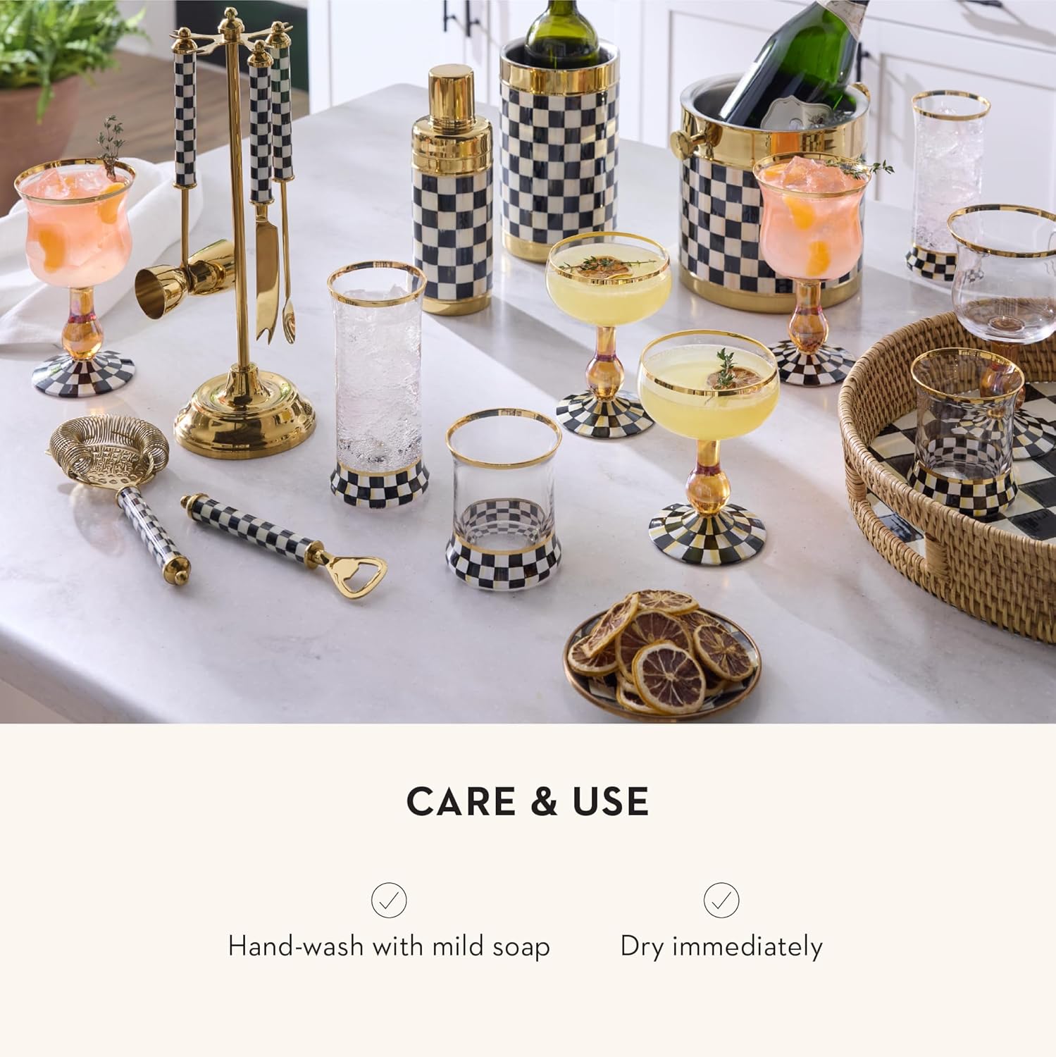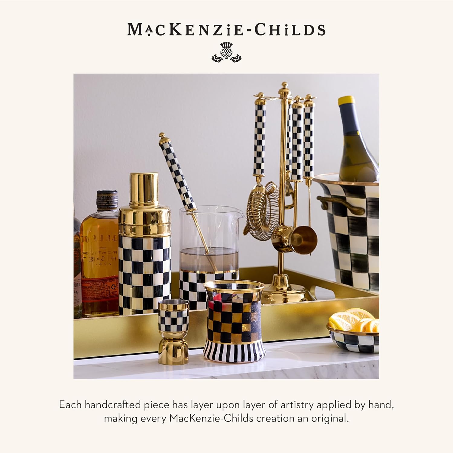 MACKENZIE-CHILDS 3260 Bar-Tool Set, 5-Piece Set with Stainless-Steel Jigger, Strainer, Bottle Opener, Mixing Spoon, Knife, and Stand, Black-and-White Courtly Check Gold