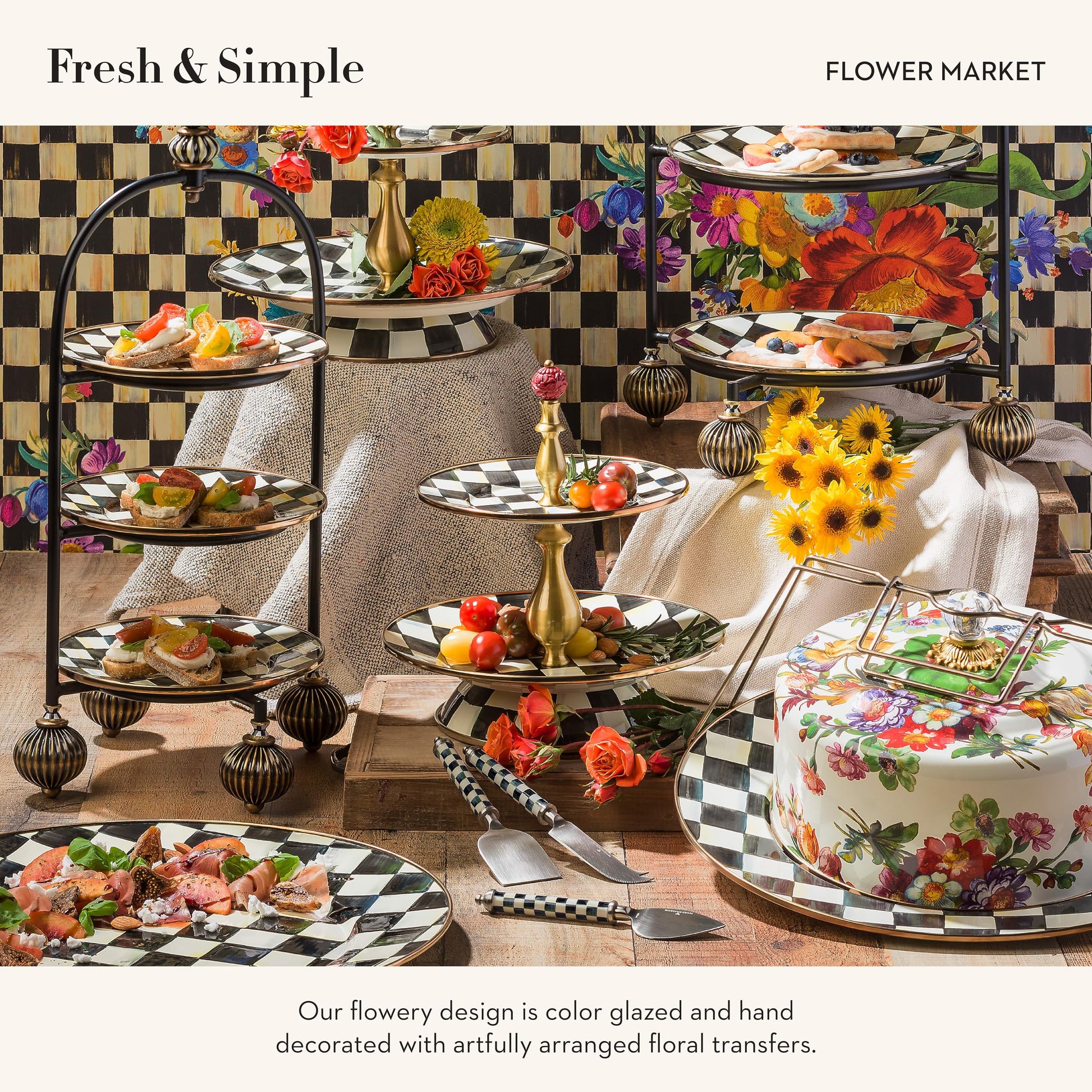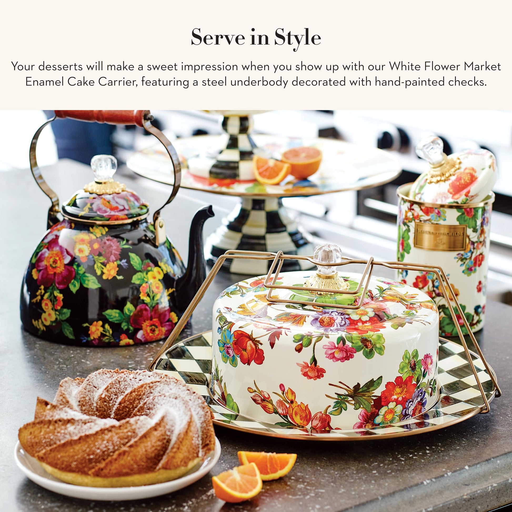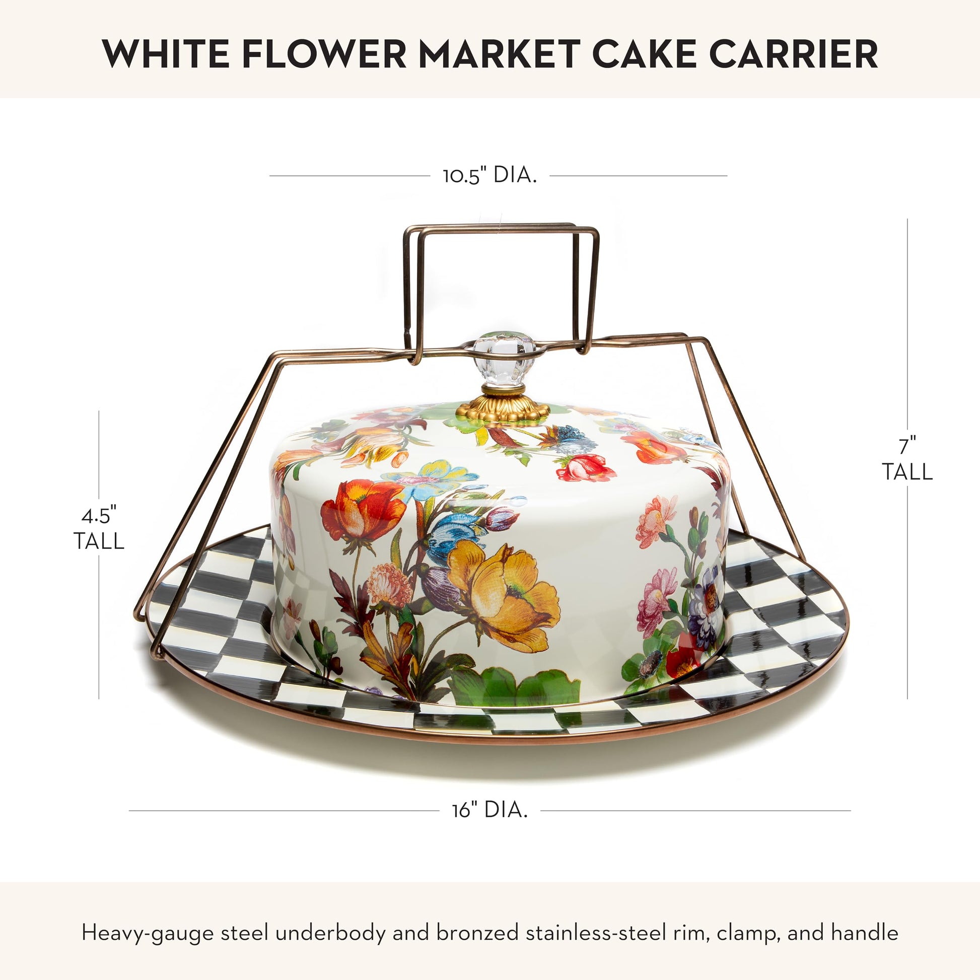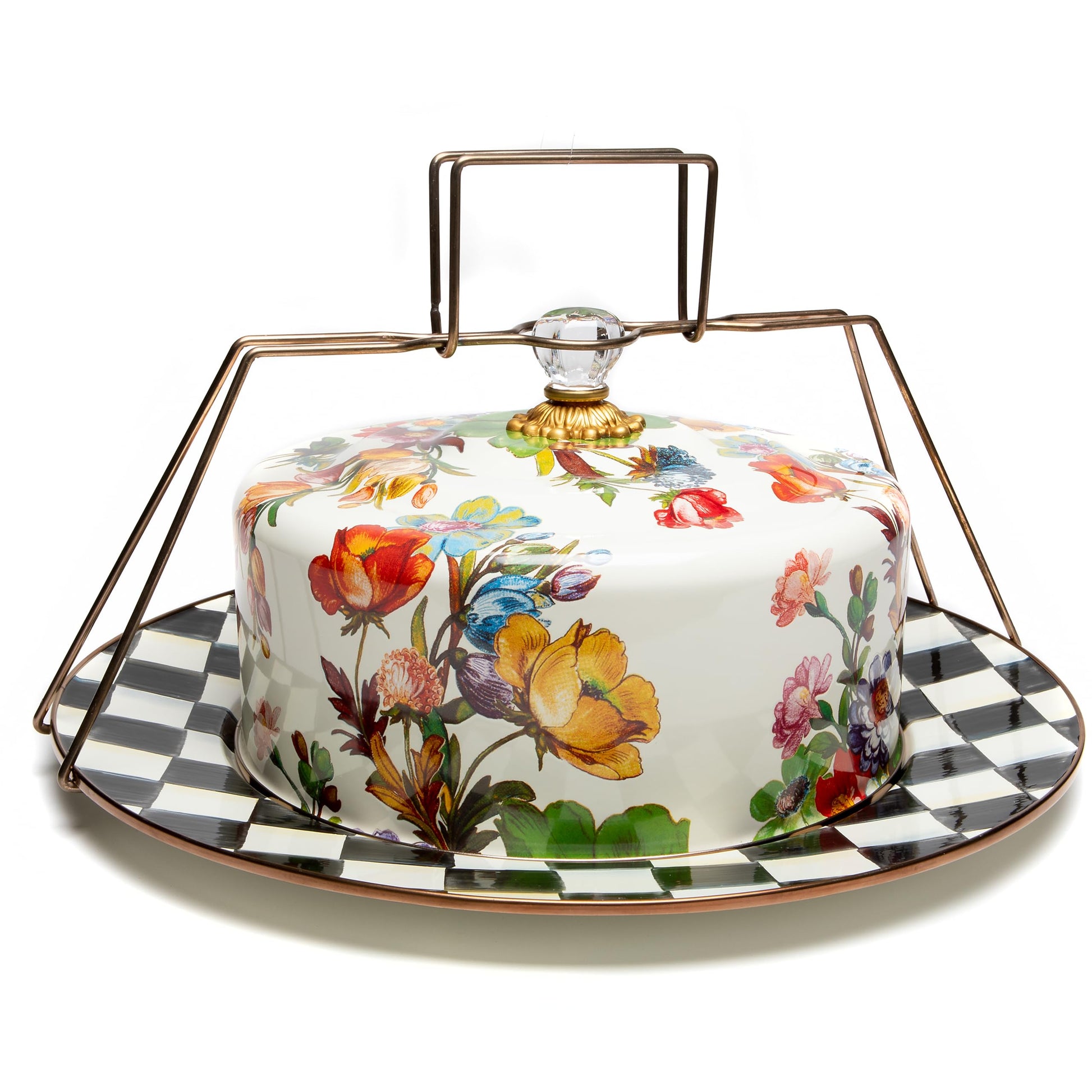 - ELEGANT SERVING ESSENTIAL: Our Flower Market cake holder features a Courtly Check platter and a glossy hand-painted white background with hand-applied floral transfers on the cake dome. It has a steel underbody crowned with a brass bobeche and topped with a clear glass knob.