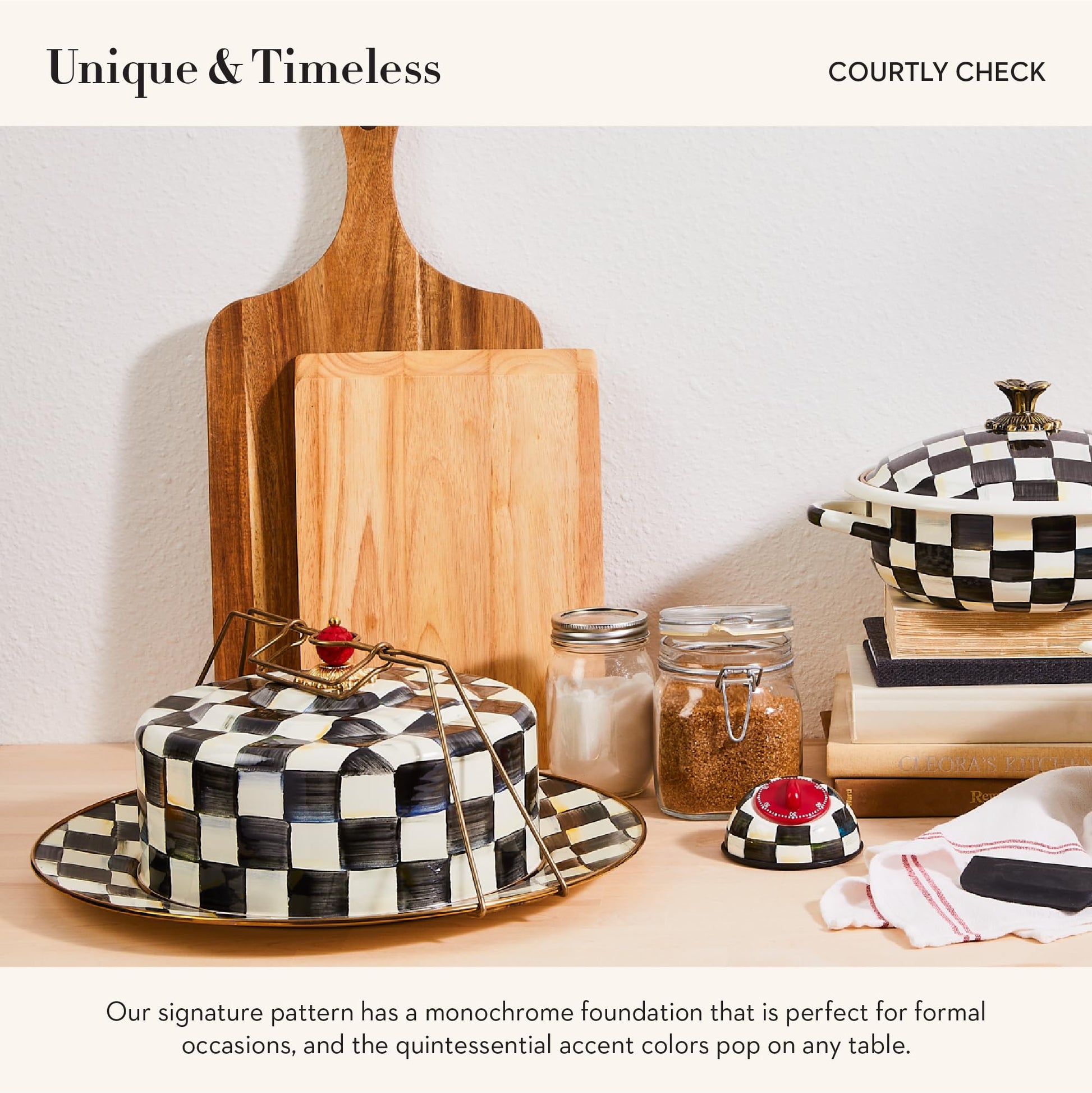 MACKENZIE-CHILDS Cake Carrier, Cake-Dish Serving Platter with Lid and Handles, White Flower Market with Black-and-White Courtly Check