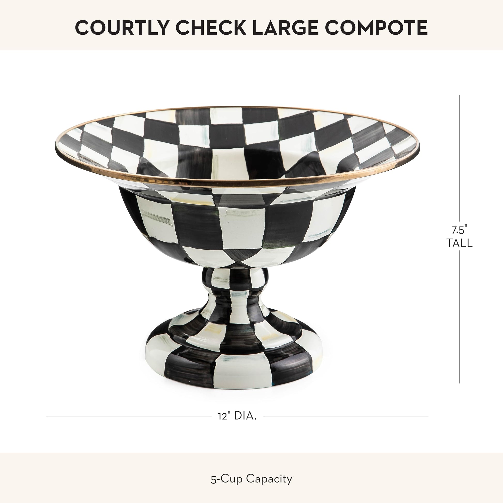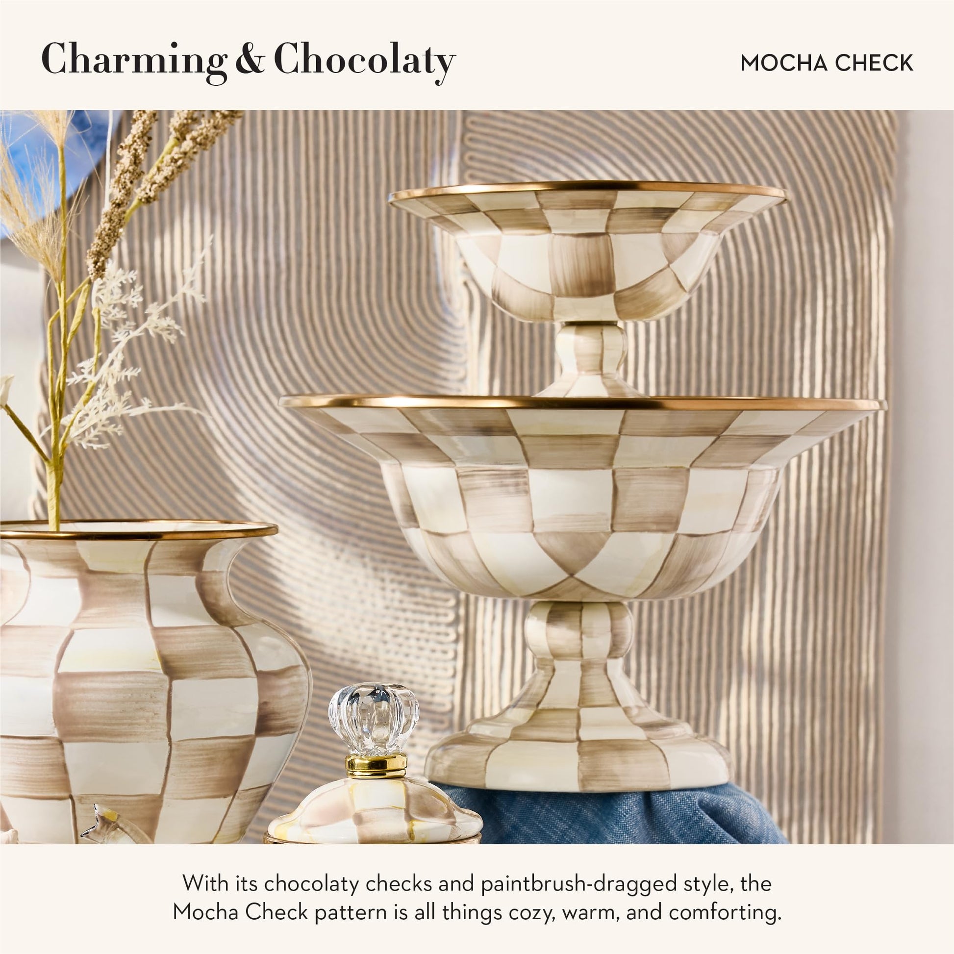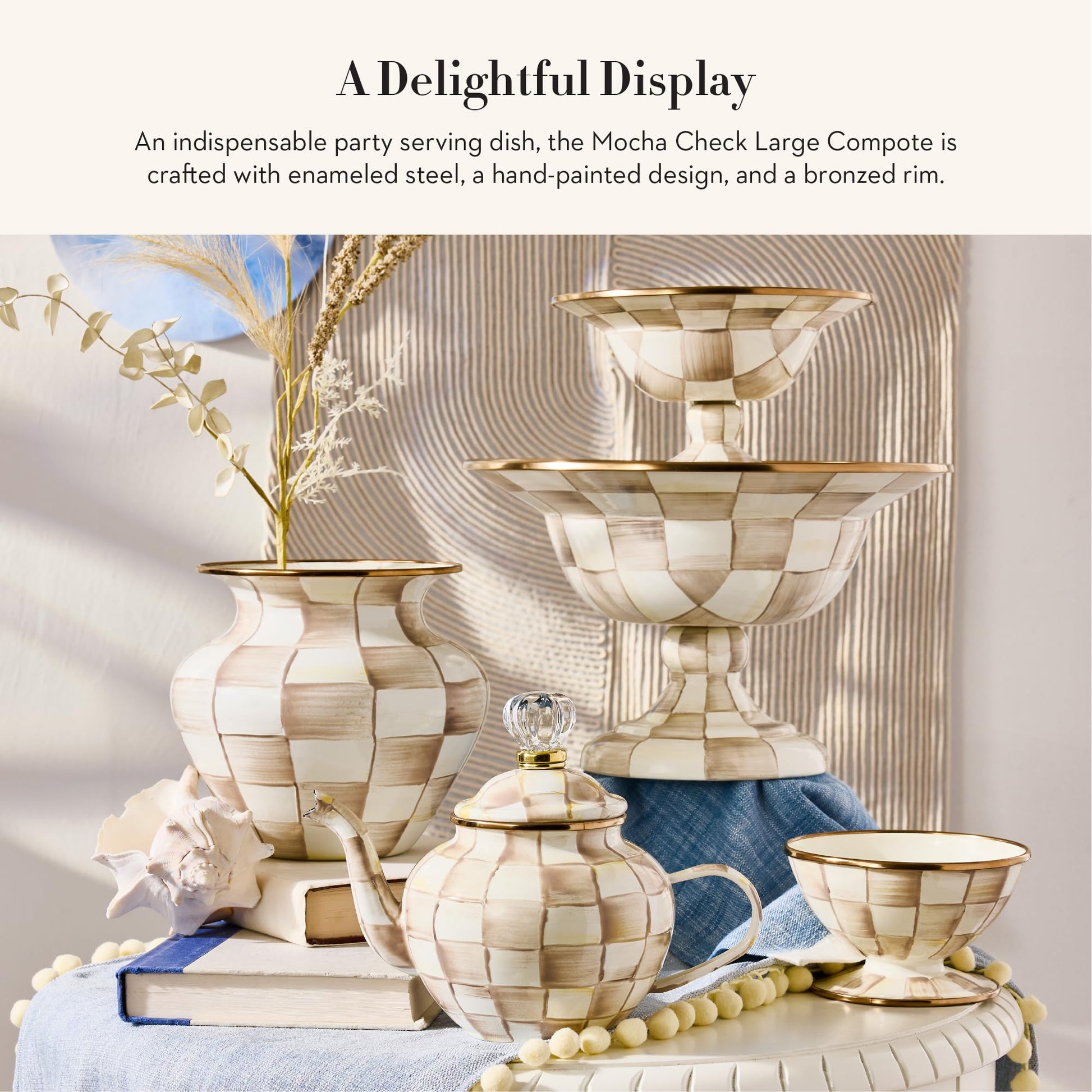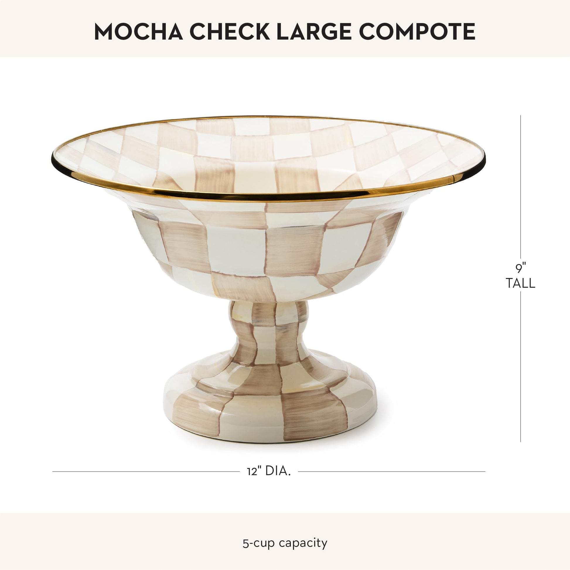 - ELEGANT SERVING ESSENTIAL: Great for serving sweets, the Mocha Check Enamel Compote is an elegant pedestal bowl for any dining table. It is decorated with hand-painted brown-and-white checks and features a steel underbody and a stainless-steel rim.