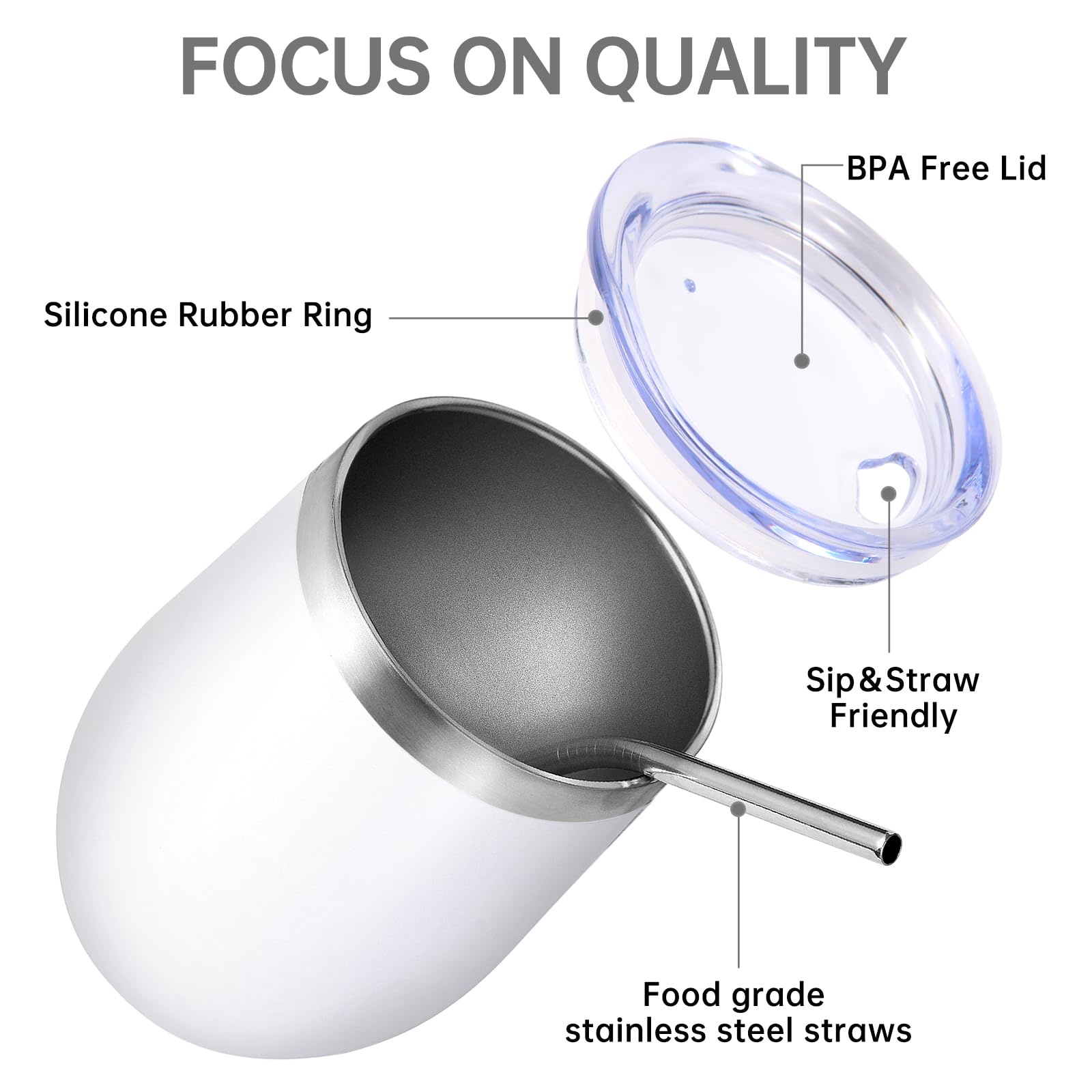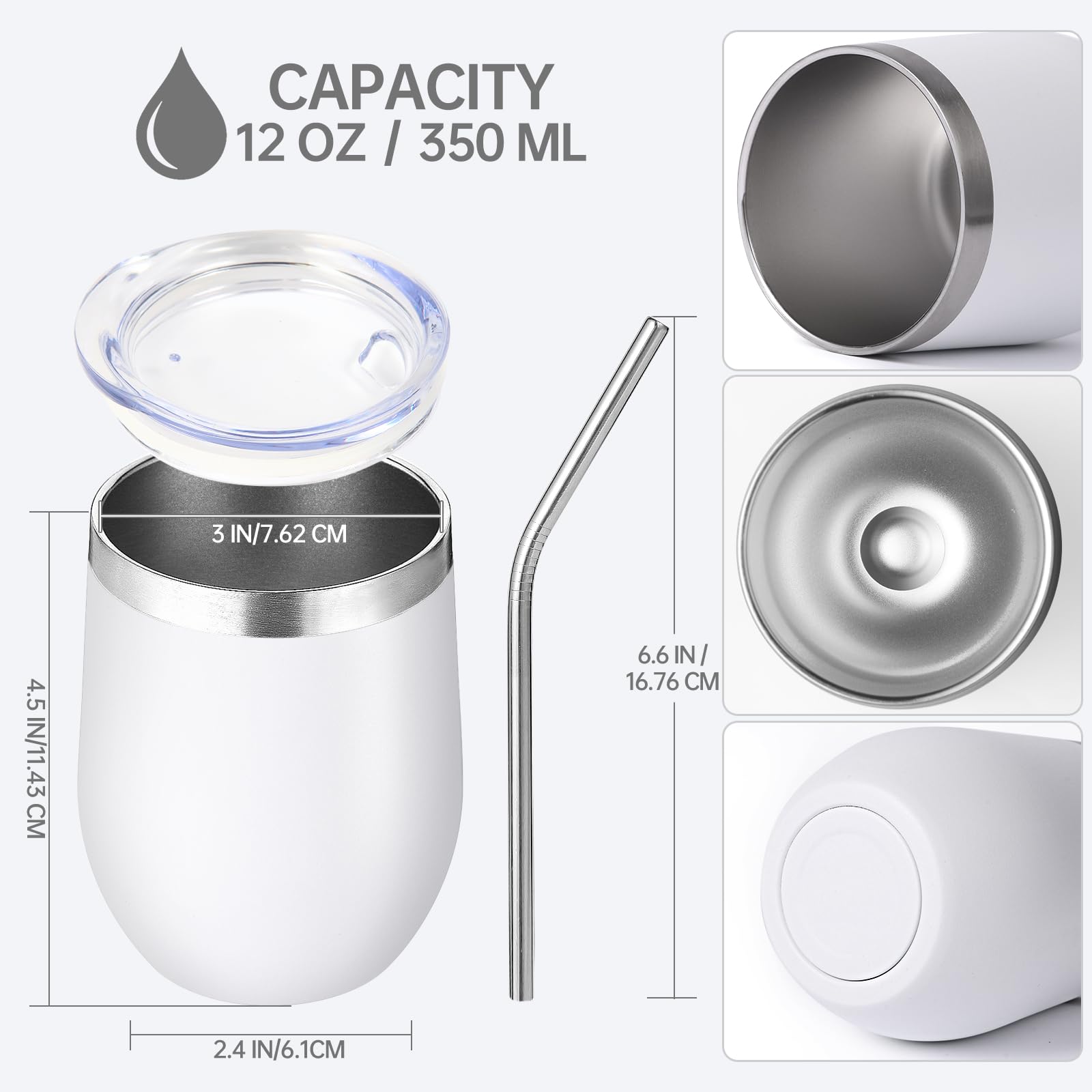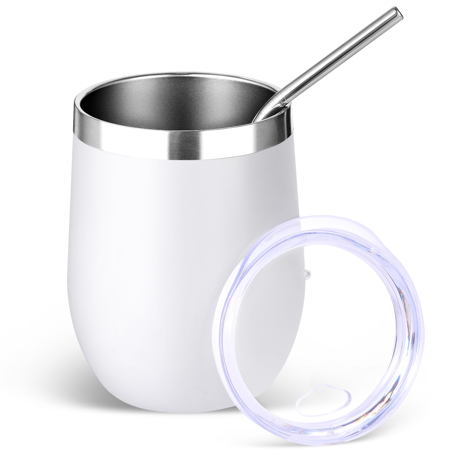 Volhoply 12oz Stainless Steel Wine Tumbler with Lid and Straw,Double Wall Vacuum Insulated Stemless Wine Glasses,Reusable Travel Coffee Mug for Cold Drinks,Small Tumblers Gifts for Women(White,1 Set)