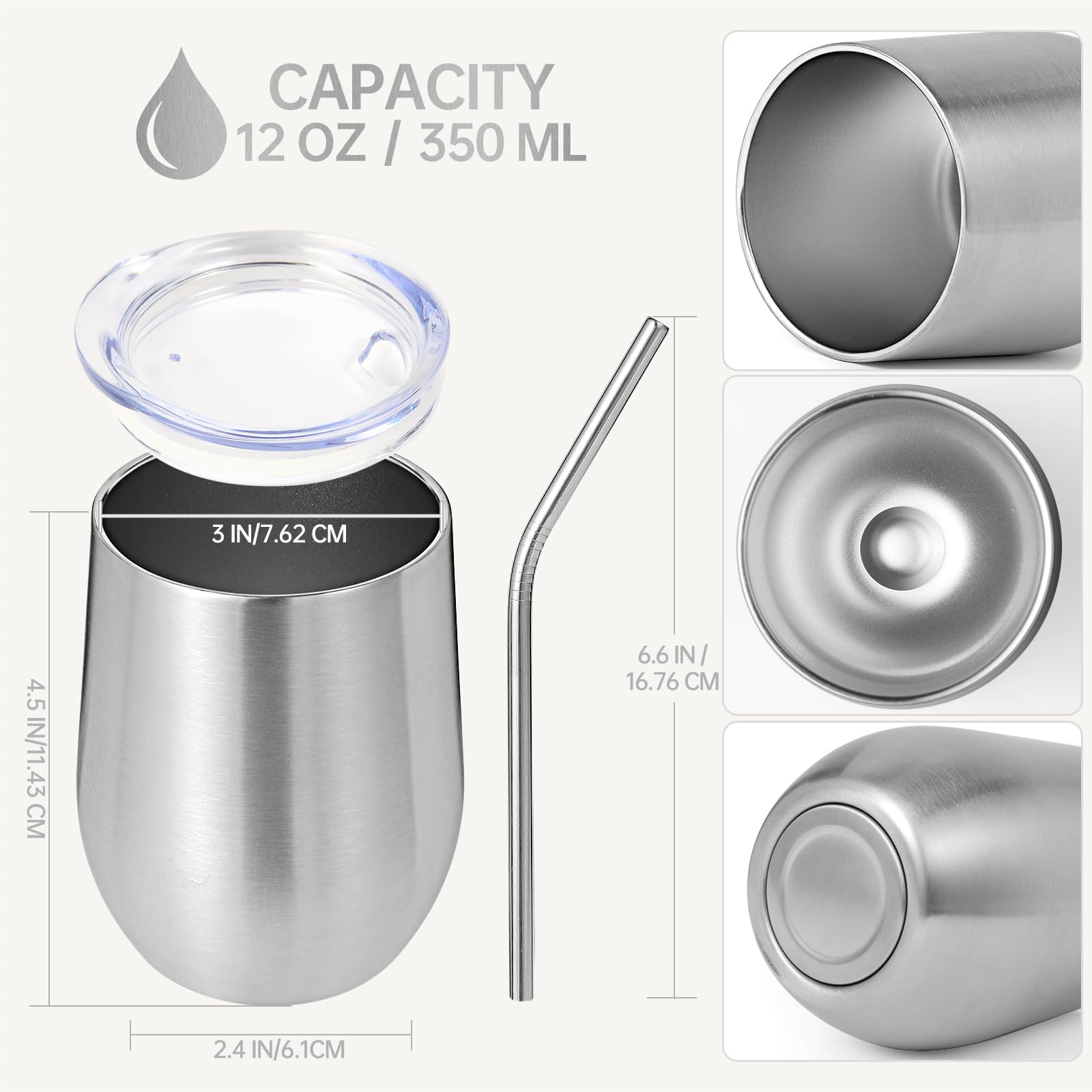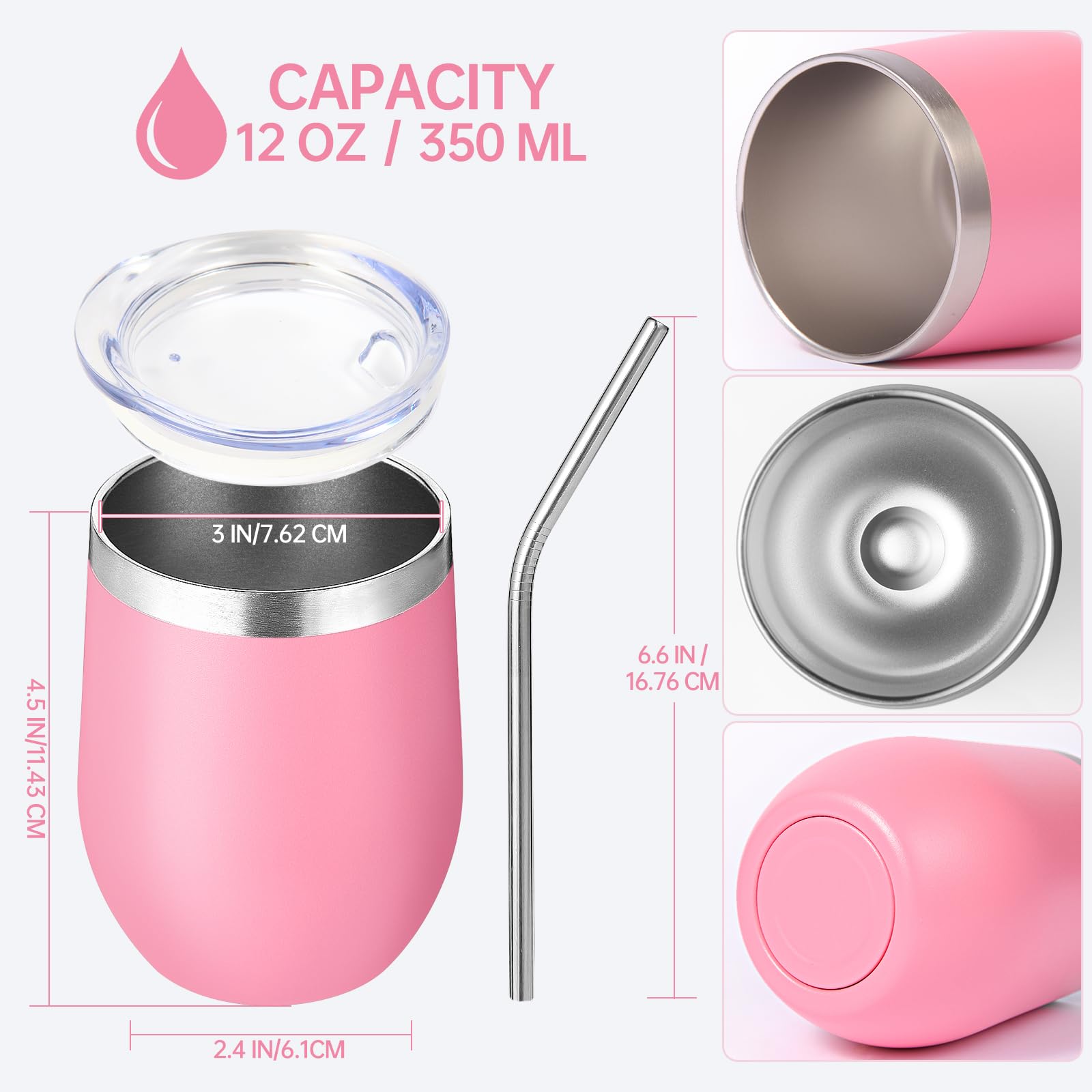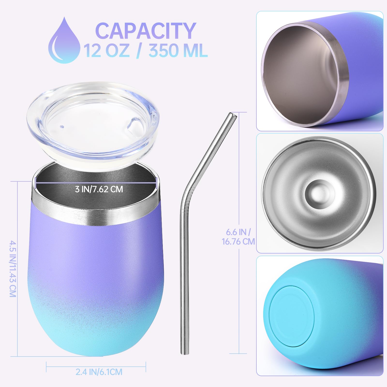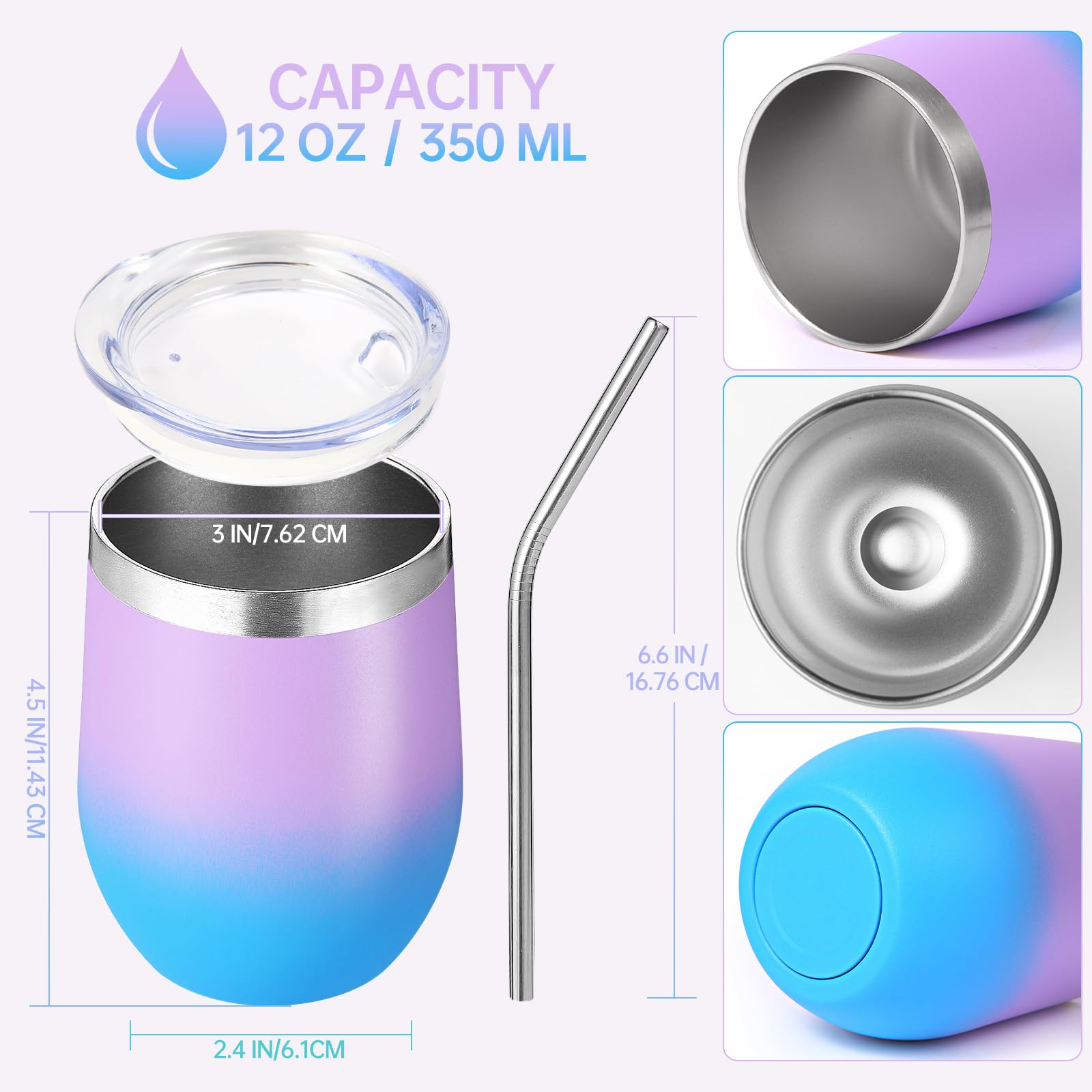 Volhoply 12oz Stainless Steel Wine Tumbler with Lid and Straw,Double Wall Vacuum Insulated Stemless Wine Glasses,Reusable Travel Coffee Mug for Cold Drinks,Small Tumblers Gifts for Women(White,1 Set)