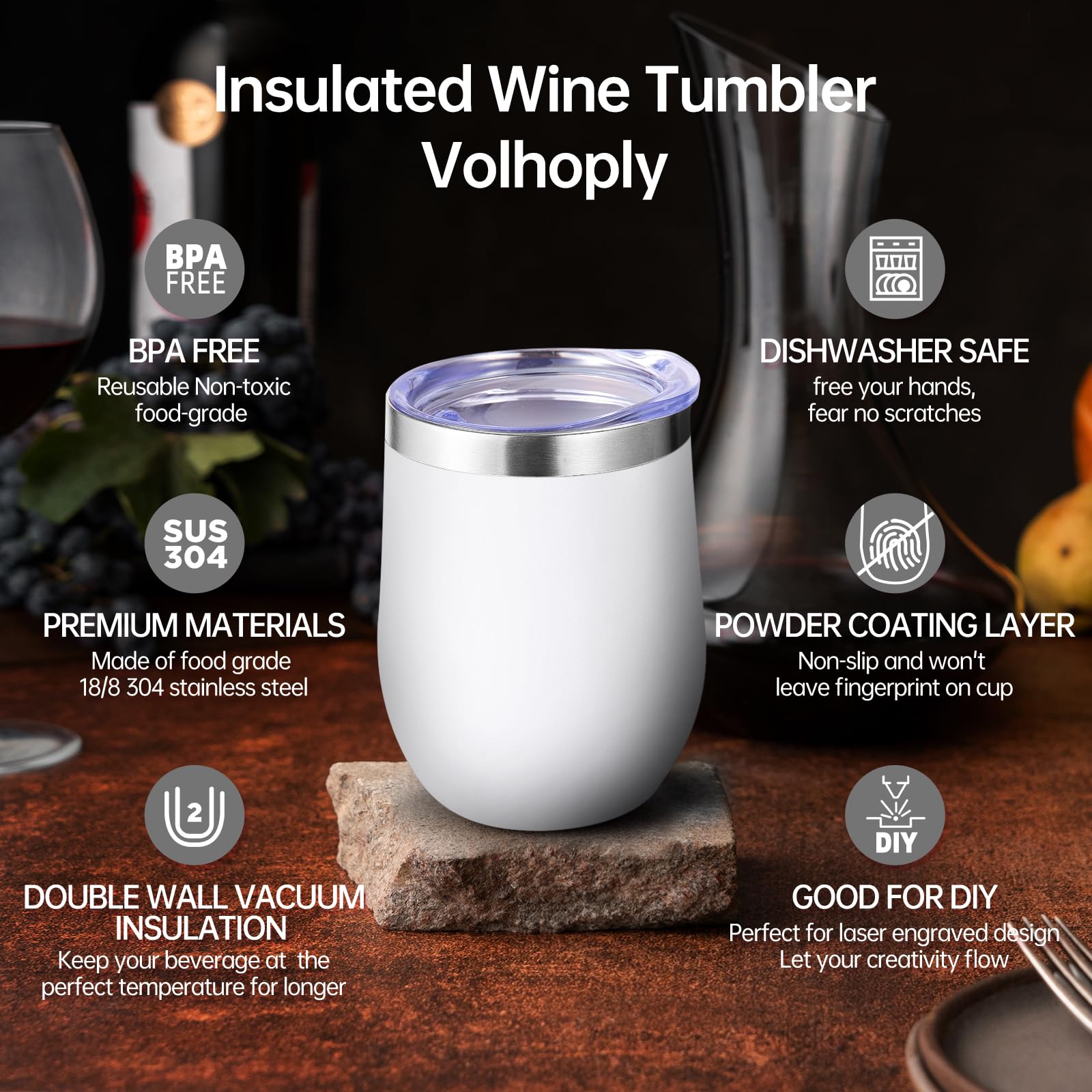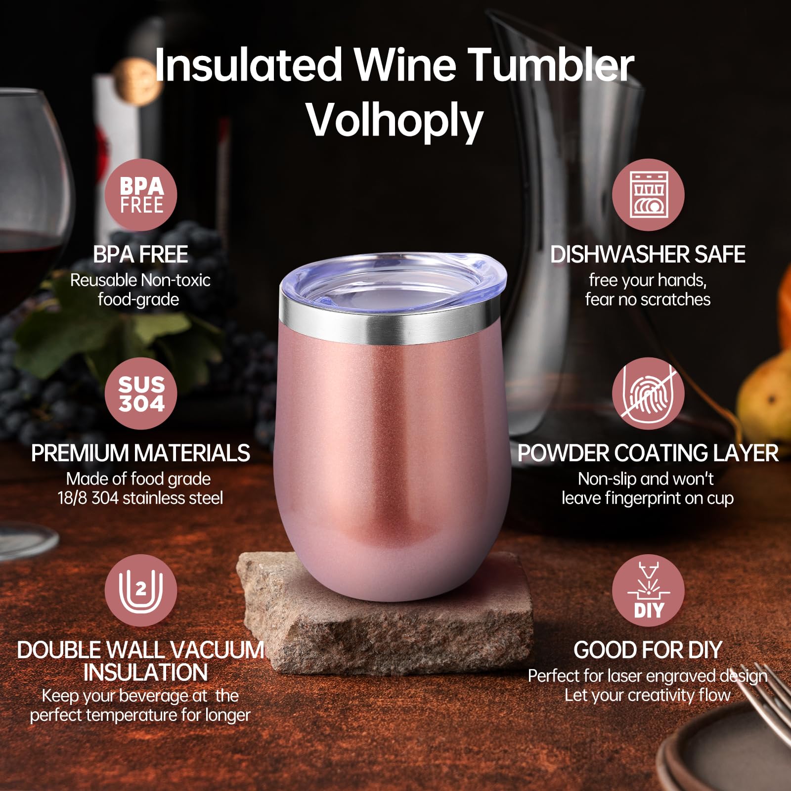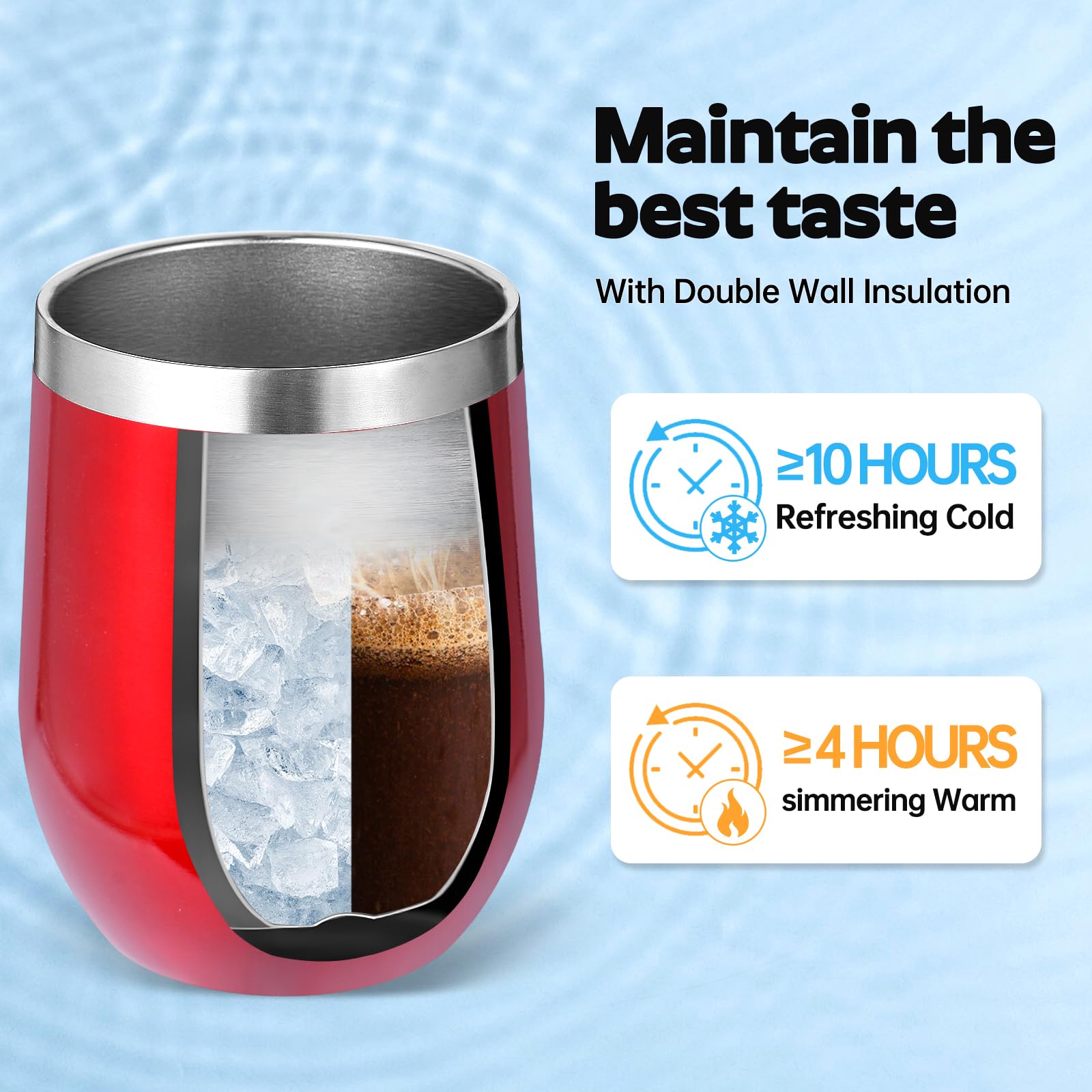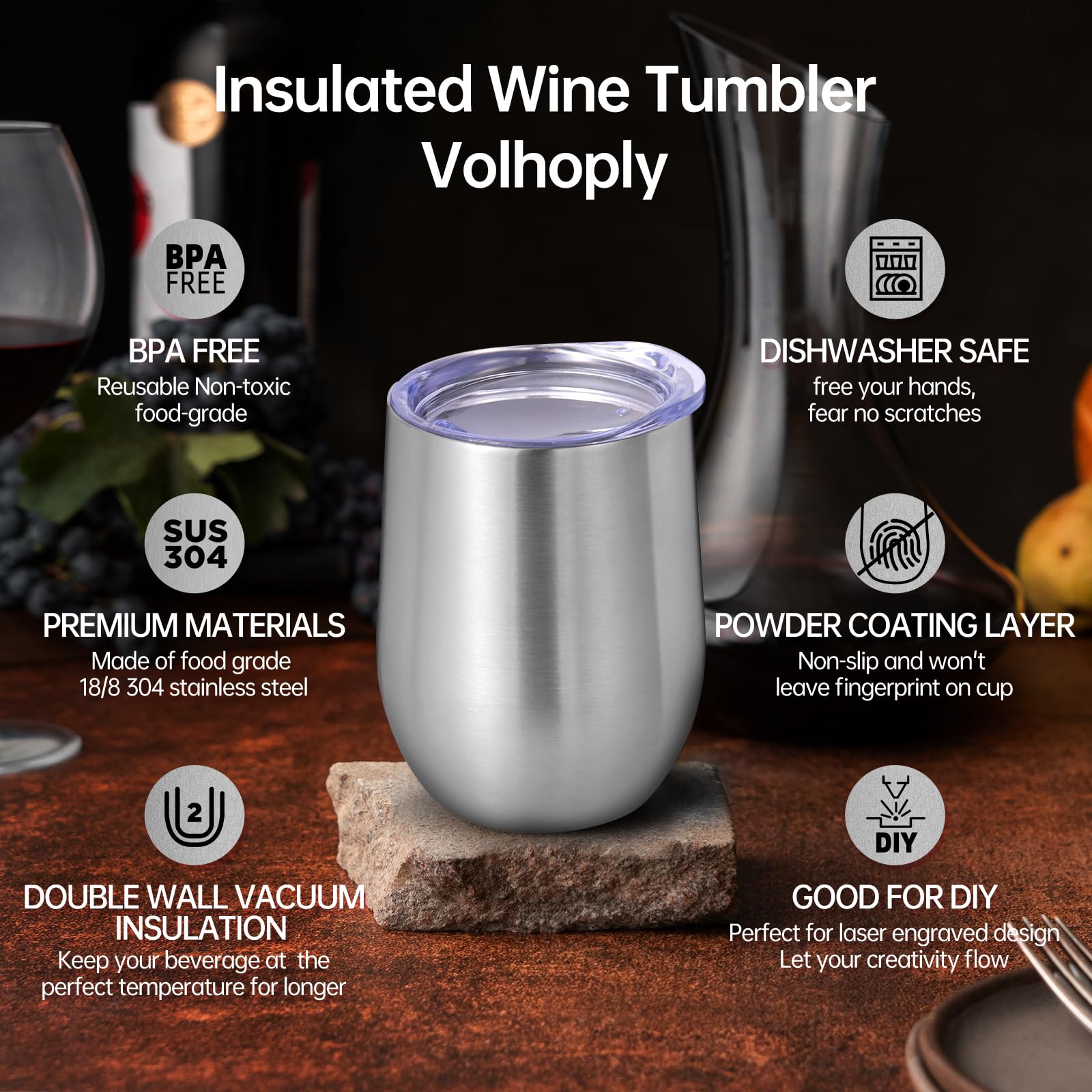 - 【Double-Walled Insulation & No Odor】 Volhoply stainless steel wine glasses use double wall vacuum insulation technology,which keeps the beverage hot for 4 hours and cold for 10 hours. The inner wall adopts electroplating inner liner technology,will not leave any odor,allowing you to enjoy the best flavor of the beverage in various situations.
