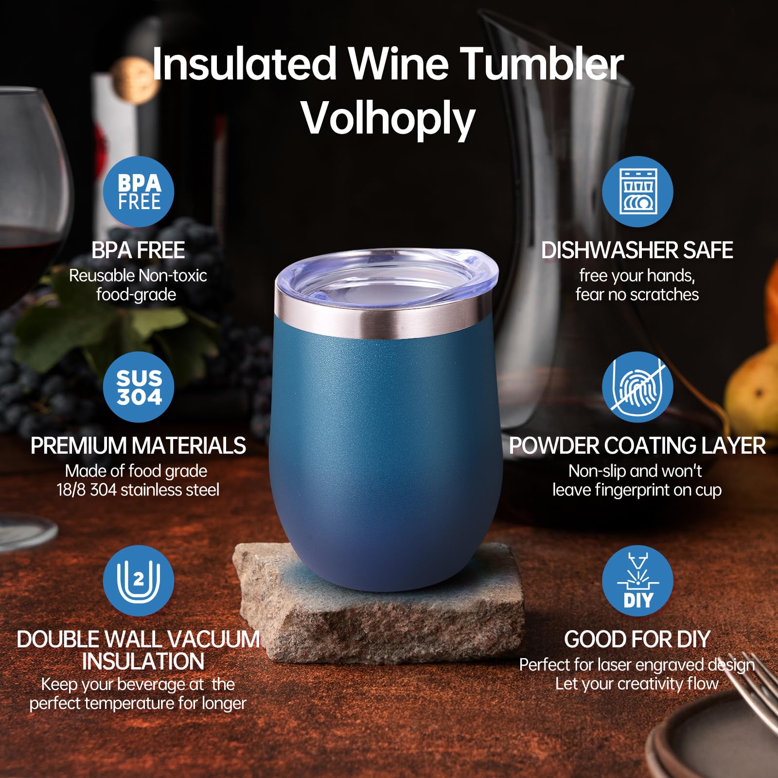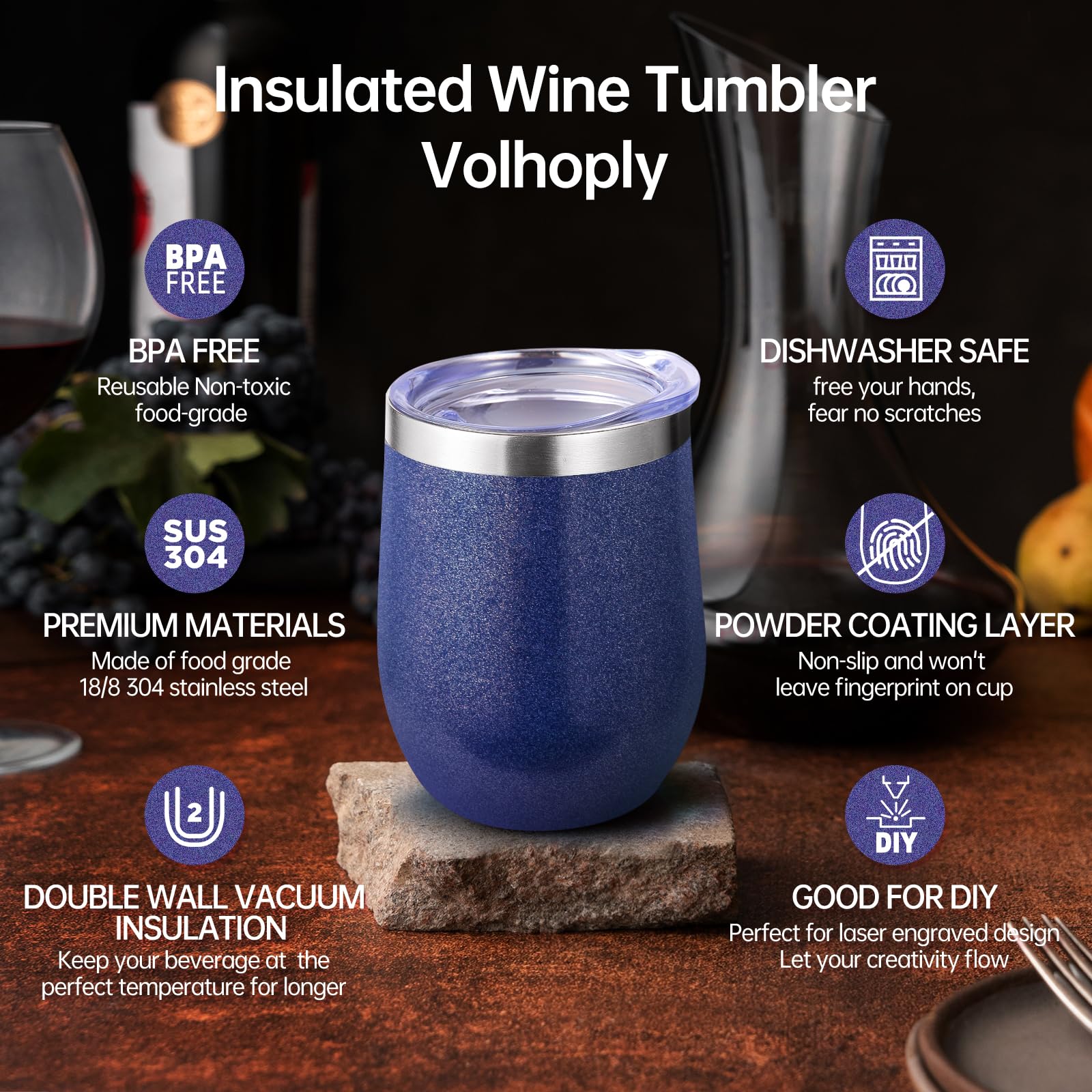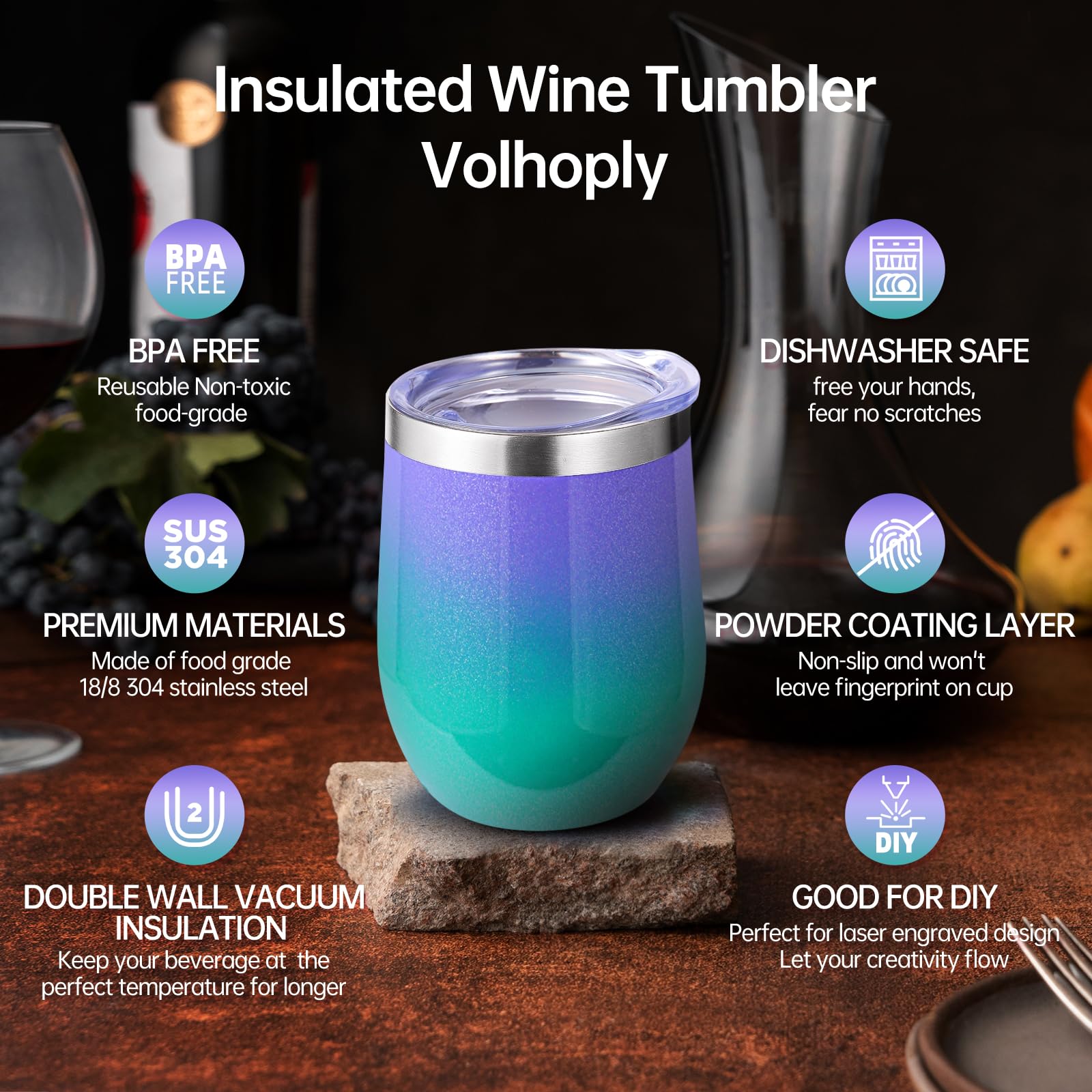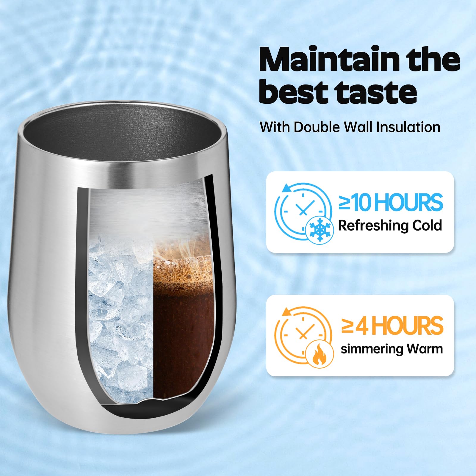 - 【Double-Walled Insulation & No Odor】 Volhoply stainless steel wine glasses use double wall vacuum insulation technology,which keeps the beverage hot for 4 hours and cold for 10 hours. The inner wall adopts electroplating inner liner technology,will not leave any odor,allowing you to enjoy the best flavor of the beverage in various situations.