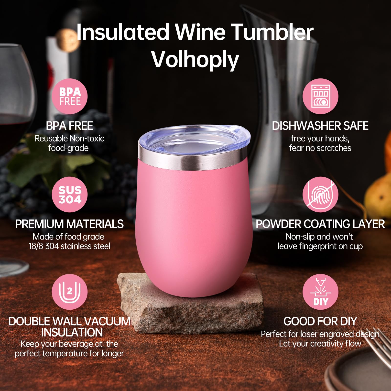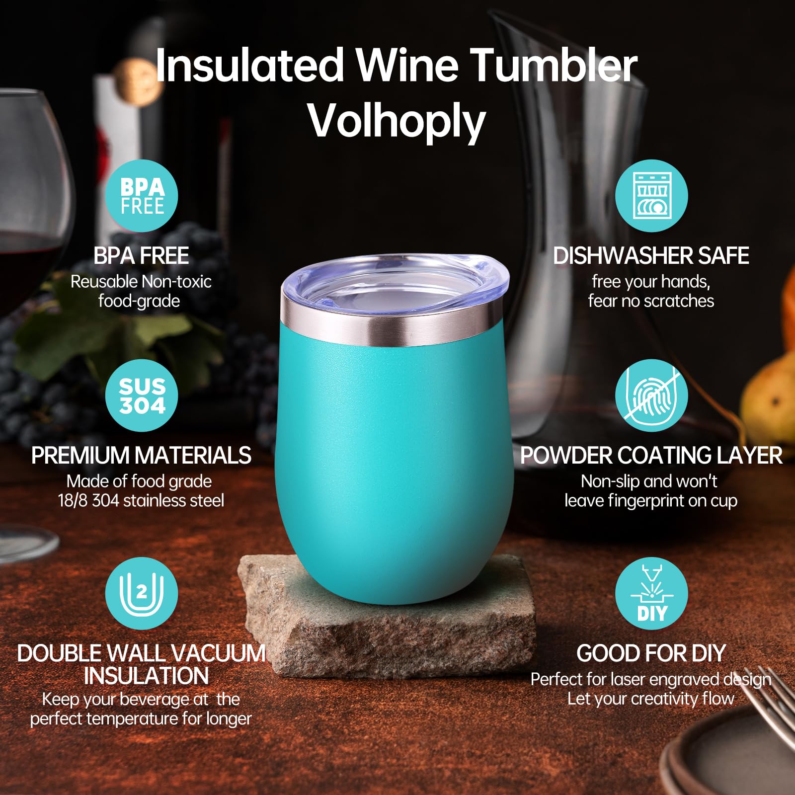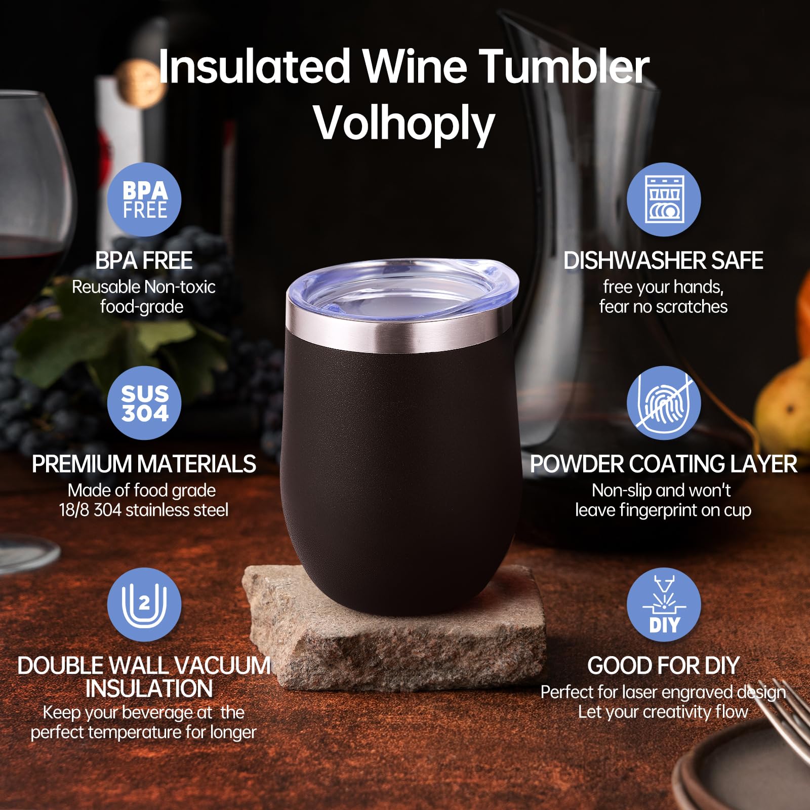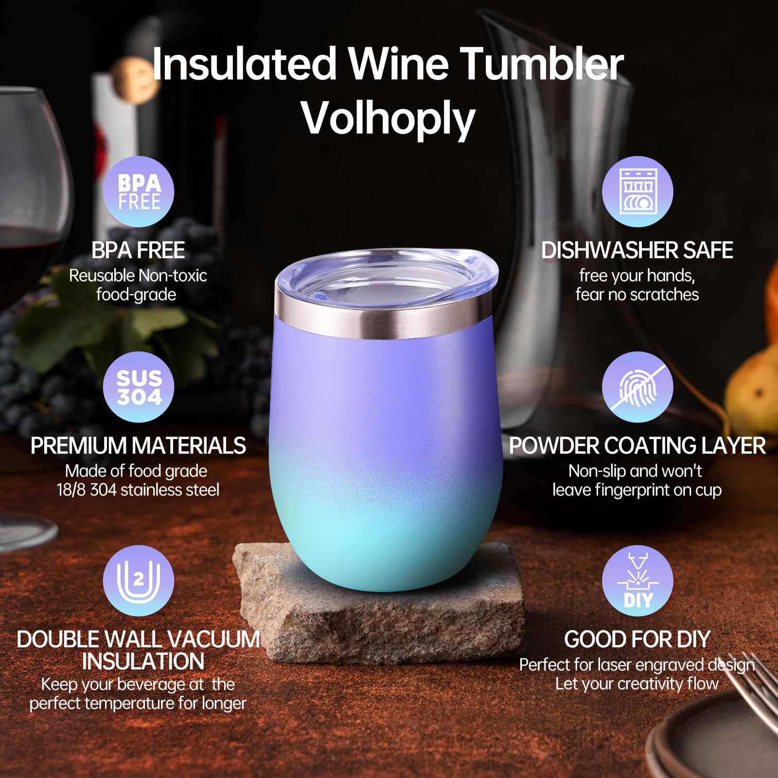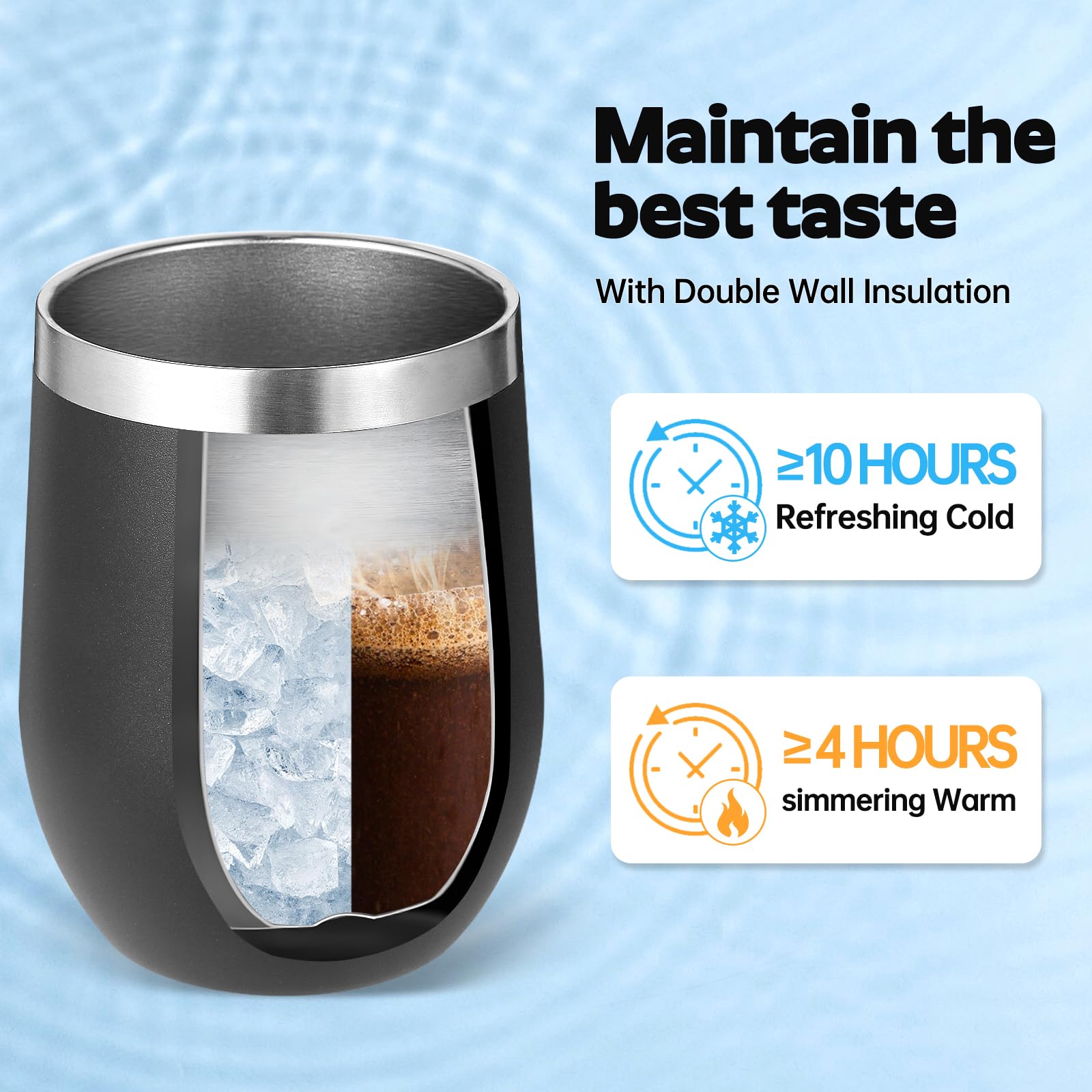 - 【Double-Walled Insulation & No Odor】 Volhoply stainless steel wine glasses use double wall vacuum insulation technology,which keeps the beverage hot for 4 hours and cold for 10 hours. The inner wall adopts electroplating inner liner technology,will not leave any odor,allowing you to enjoy the best flavor of the beverage in various situations.