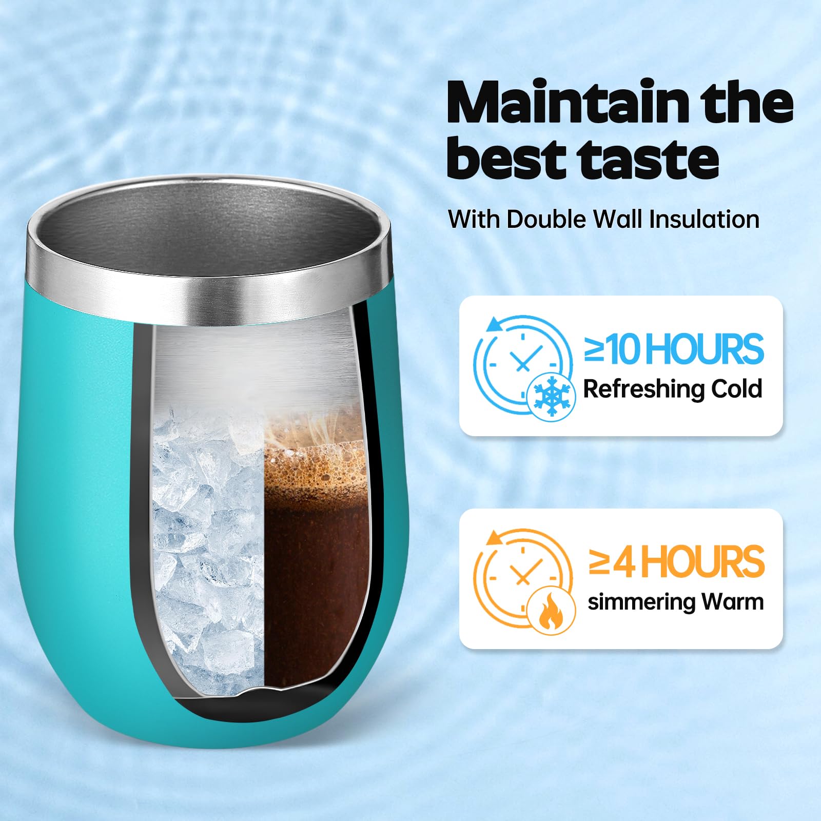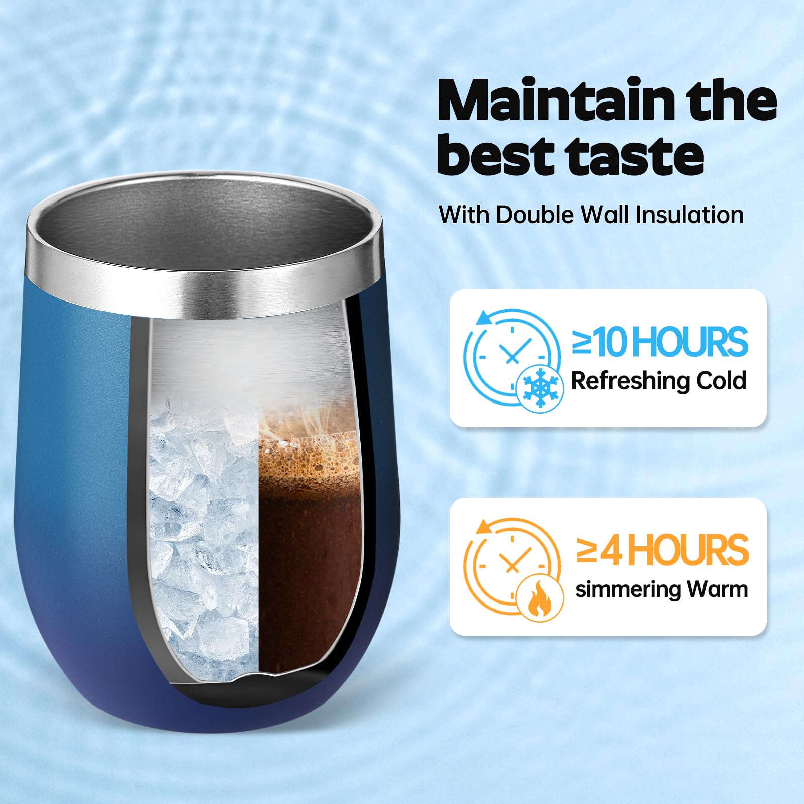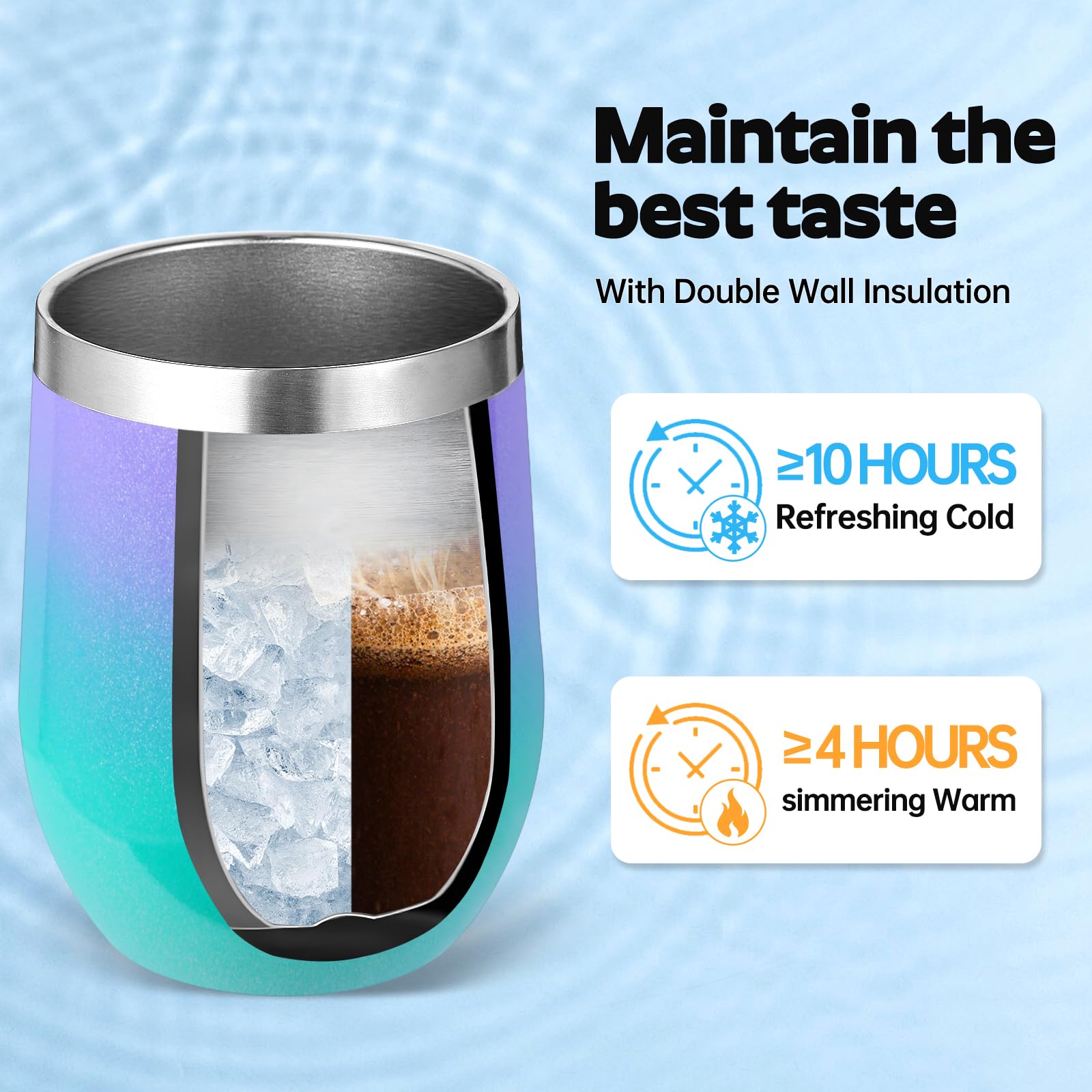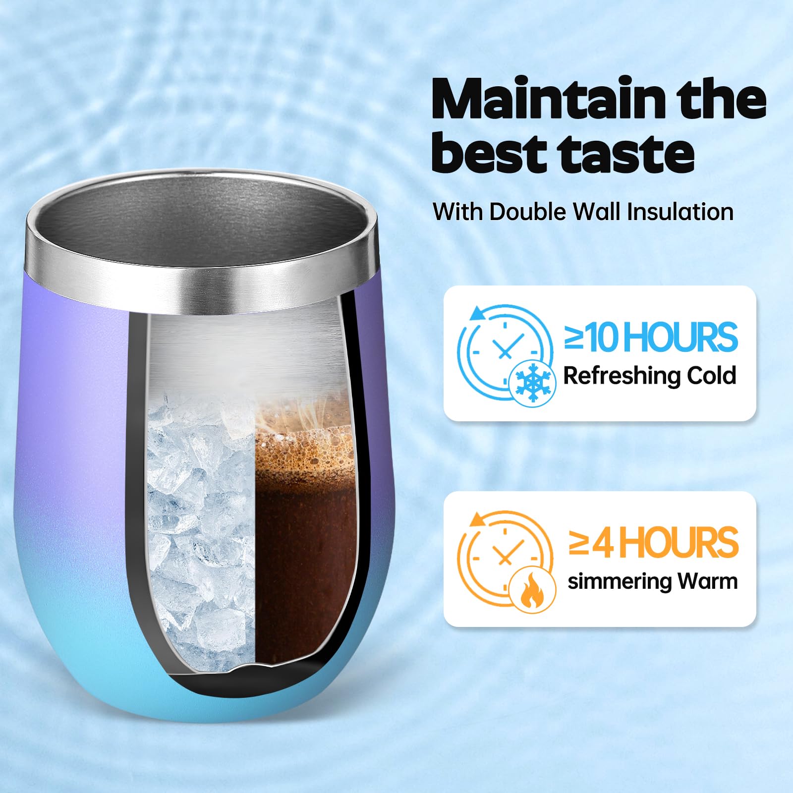 - 【Double-Walled Insulation & No Odor】 Volhoply stainless steel wine glasses use double wall vacuum insulation technology,which keeps the beverage hot for 4 hours and cold for 10 hours. The inner wall adopts electroplating inner liner technology,will not leave any odor,allowing you to enjoy the best flavor of the beverage in various situations.